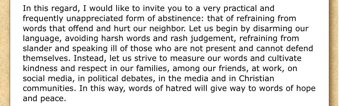 So of course, what the Holy Father shared makes sense: if we want a more peaceful and loving world, we begin by abstaining from harsh and hurtful language. And for those of us who are brothers and sisters in faith, we can make space for grace by fasting from that endlessly hungry gremlin — the words from which all beefs begin.